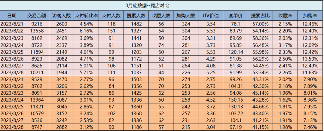 “了解競店的爆款產品,進行數據對比。因為各個店鋪結構的不同,我們會進行對應的改變,使用差異化競爭。”光灝告訴我們,“每周競店數據進行對比,持續感知競店的實時動向,避免運營品牌店鋪被超越。”