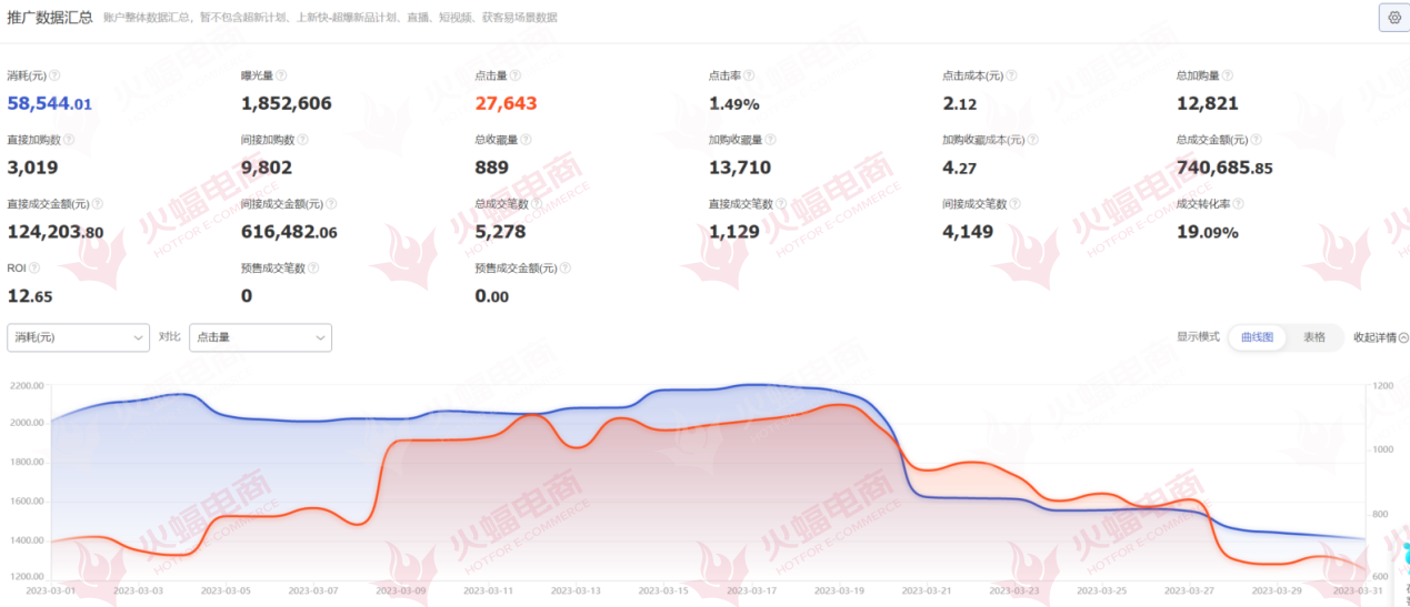 在店鋪流量上,接手前訪客主要來源于直播,單一渠道顯然不符合多維度運營的要求。合作之后,火蝠電商結合市場增量趨勢,聚焦有美容保健需求的特定人群,在站內,配合直通車、引力魔方、萬相臺三大營銷工具組合加碼完成大量曝光蓄水并實現成交金額爆發。直通車方面,利用「達摩盤」優選人群,剔除不精準展現量和點擊量。而后針對「品牌詞」「趨勢明星」「產品核心詞等,集中火力為店鋪爆品搭建專項計劃組;引力魔方方面,依舊是老計劃進行刪減調優,以店鋪拉新和店鋪行為人群進行投放;萬相臺方面,以日常拉新和貨品加速交替打法進行推廣,當貨品加速推廣進入衰退期后,及時根據節奏替換新計劃。結果是,3月「直引萬」點擊率與轉化率較2月份整體上升。