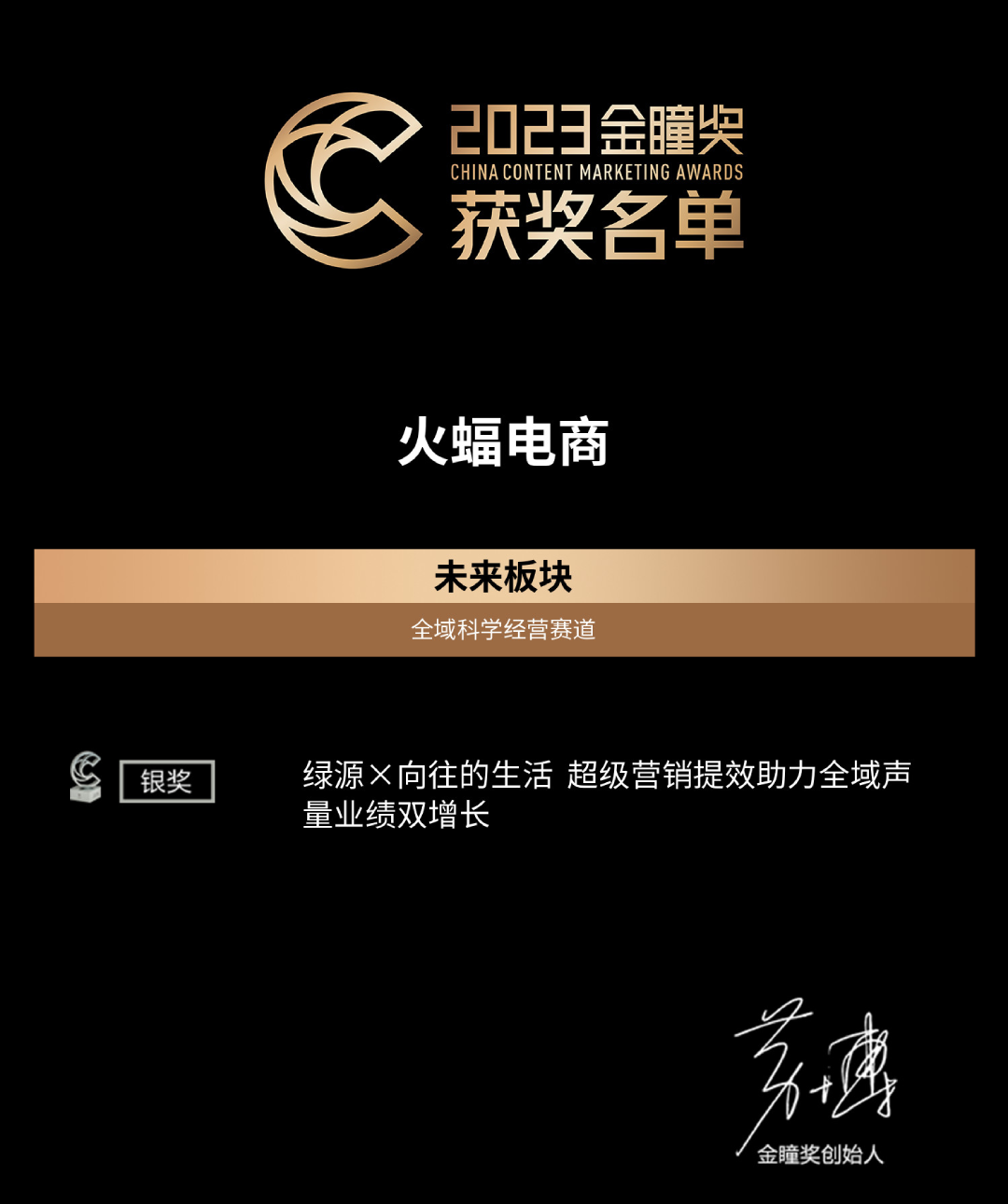 9月23日,2023金瞳獎頒獎典禮在北京圓滿落幕。會上,知名綜合電商服務商,武漢火蝠電子商務有限公司(以下簡稱“火蝠電商”)創意作品《綠源×向往的生活 超級營銷提效助力全域聲量業績雙增長》成功斬獲2023金瞳獎-未來板塊-全域科學經營賽道【最具數智經營力品牌——銀獎】,此舉不僅獲得行業高度關注,更再次證明了火蝠電商的綜合運營服務能力。