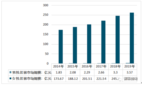 2019年我國絲襪行業市場規模266.4億元,其中,男性絲襪市場規模3.57億元,女性絲襪市場規模262.83億元。