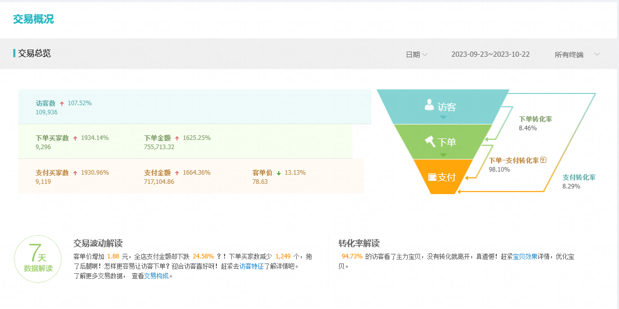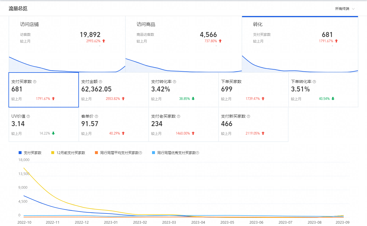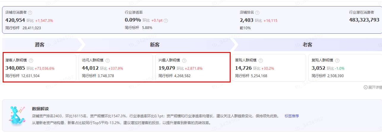 1.店鋪的流量投入,在付費工具以及站內外配合上拉新力度較小,人群流轉上資產轉化增長幅度較低;